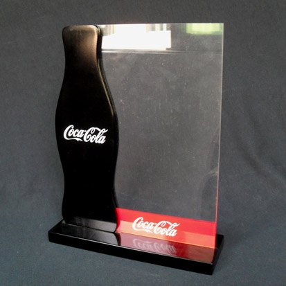 出口歐美的可樂臺卡,深圳源藝坊工藝品有限公司專業(yè)定做。顏色有黑色和紅色。此款臺卡非注塑產(chǎn)品,純手工膠水粘接成型。瓶子底部采用螺絲固定,顏色采用亞克力透明板噴漆形成、logo采用絲印方式。側(cè)板有兩塊透明板,更換廣告彩頁更方便,更快捷。